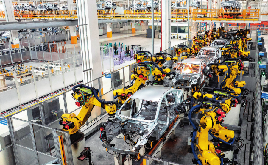 在位于湖南省長沙市的比亞迪長沙雨花工廠,機械臂進行車身焊接作業(yè)(2024年3月21日攝)。 陳思汗攝/本刊