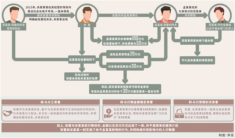 王利萍:根據(jù)在案證據(jù),最終將張雷此行為定性為對有影響力的人行賄罪主要有兩方面原因:一方面,張雷和關(guān)某某在駕?紙鲰椖可陥筮^程中存在合謀商議送錢請托辦事、積極策劃的行為,應(yīng)屬于共同犯罪;另一方面,孟某某和范某某是好友關(guān)系,平時交往比較頻繁,范某某也認(rèn)可與孟某某的好友關(guān)系,孟某某屬于與國家工作人員關(guān)系密切的人。因此,張雷的行為符合對有影響力的人行賄罪的構(gòu)成要件。