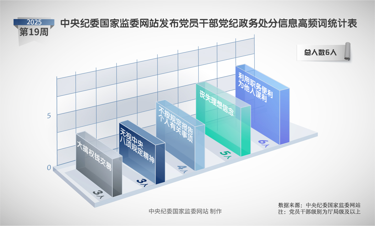 2025年第19周,在中央紀委國家監(jiān)委網(wǎng)站發(fā)布的6條黨紀政務(wù)處分通報中,“喪失理想信念”“不按規(guī)定報告?zhèn)人有關(guān)事項”“利用職務(wù)便利為他人謀利”“無視中央八項規(guī)定精神”“大搞權(quán)錢交易”是高頻詞。
